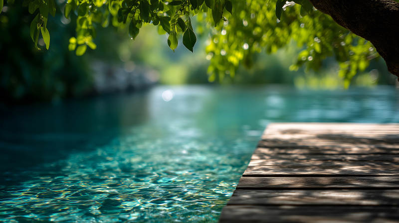 水边木板与绿植的宁静景象