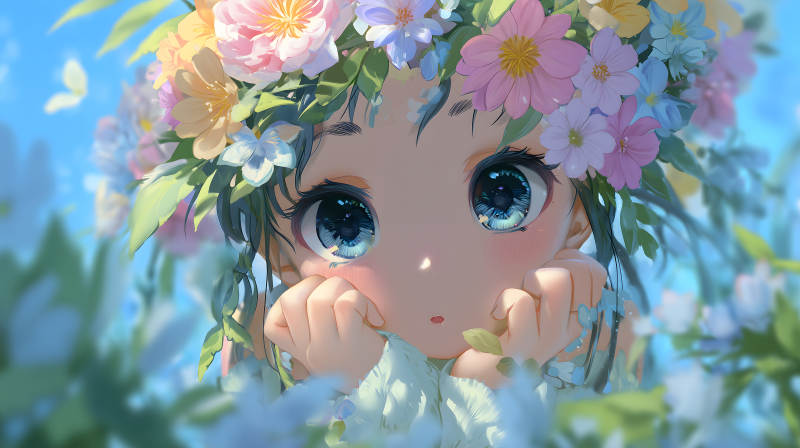 戴着花环的可爱女孩注视着你