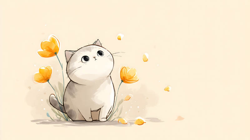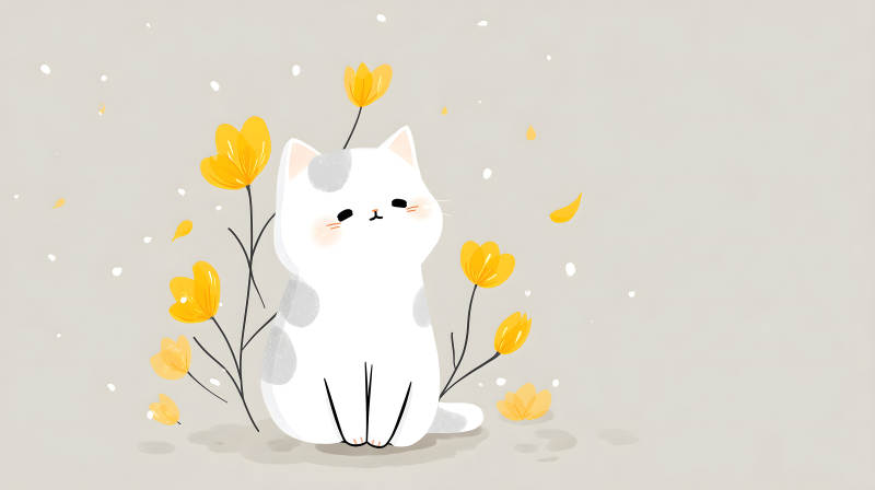 可爱小猫与黄色花朵的温馨插画