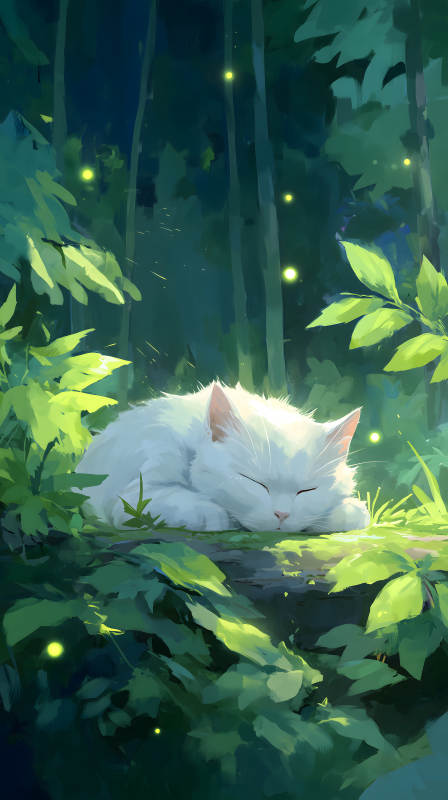 森林中熟睡的白猫