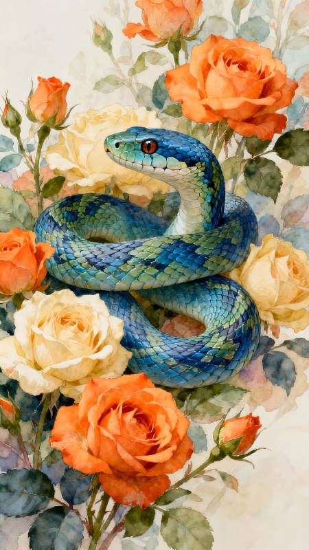 蛇与玫瑰的唯美水彩画
