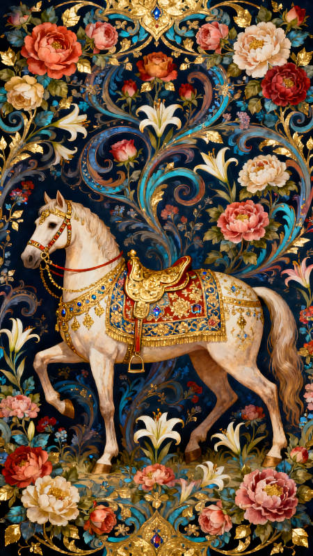 华丽马匹与繁花锦簇的装饰画
