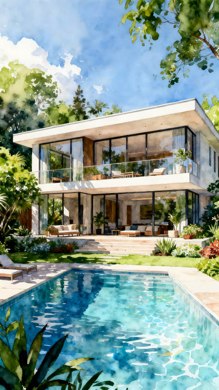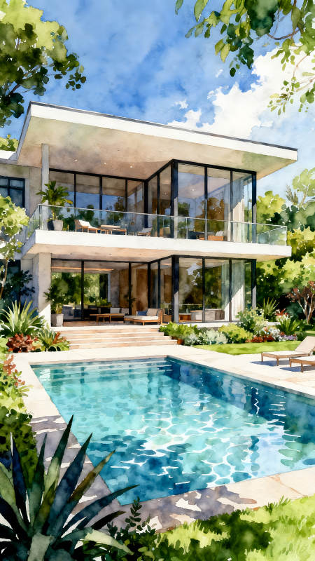 水彩风格豪宅与泳池风景优美环境舒适