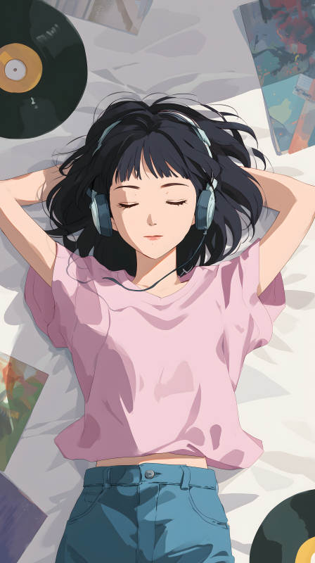 女孩躺在唱片上听音乐