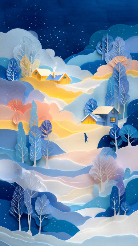 冬日村庄剪纸风景