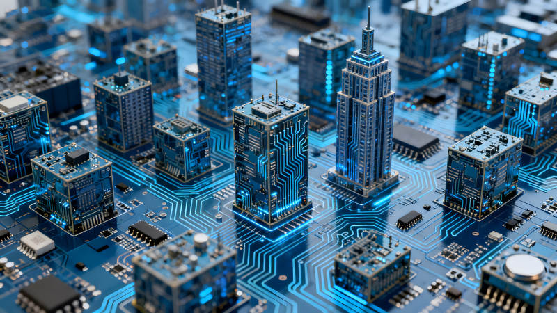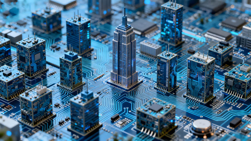 电路板上建筑模型构成的未来城市景象