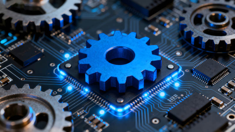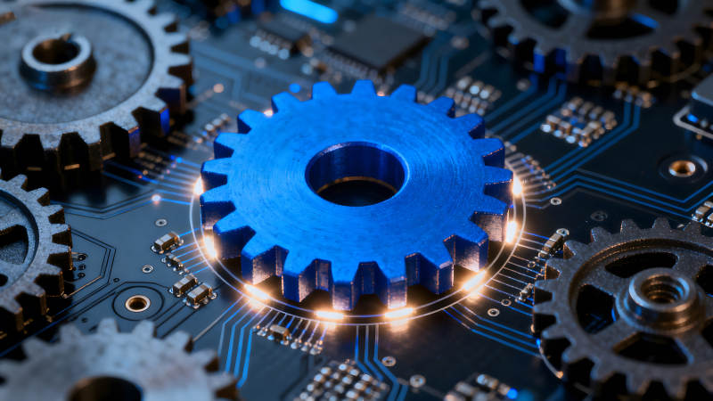 电路板上蓝色的齿轮和芯片