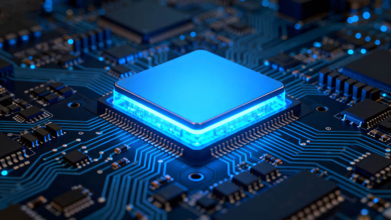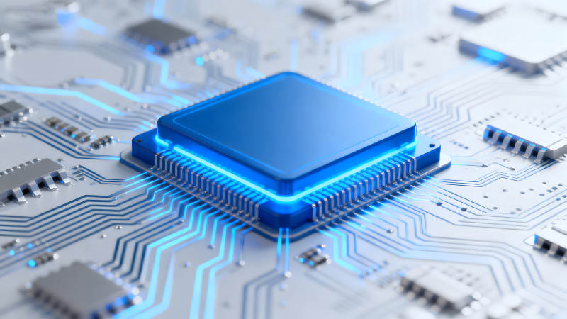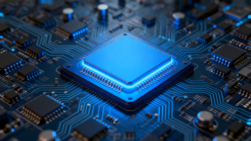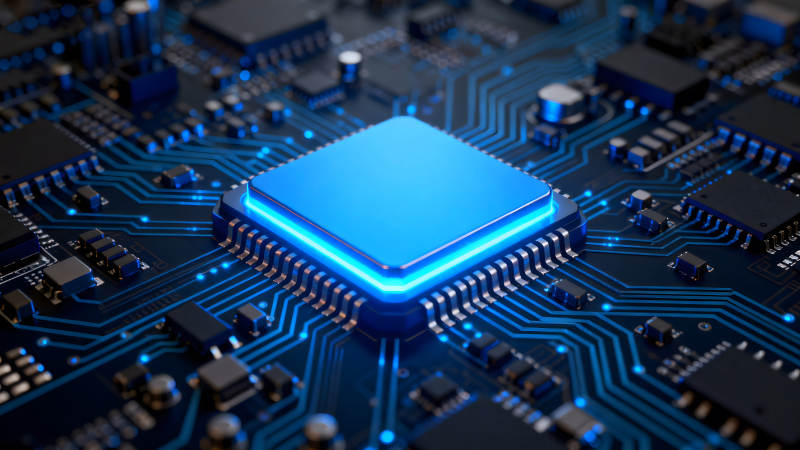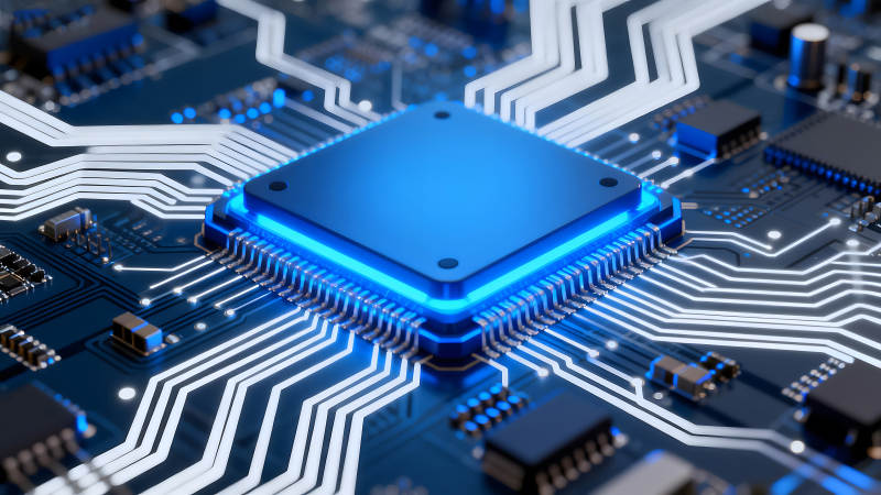 蓝色芯片与电路板特写