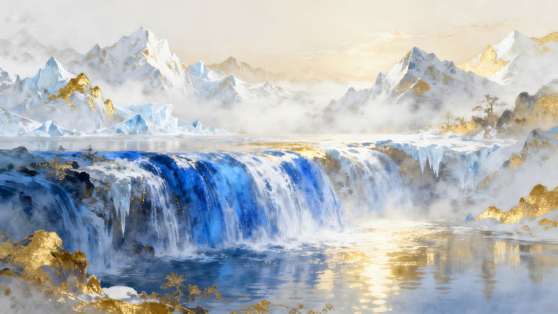 冰雪瀑布与金色山脉的唯美画卷