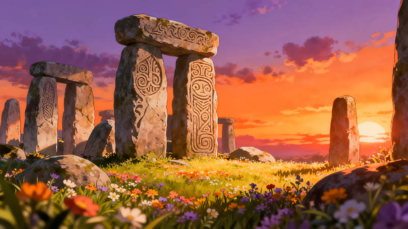 日落下的巨石阵花海