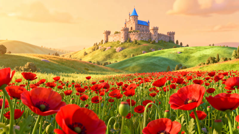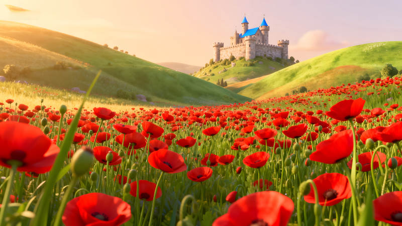 城堡与罂粟花田的田园风光