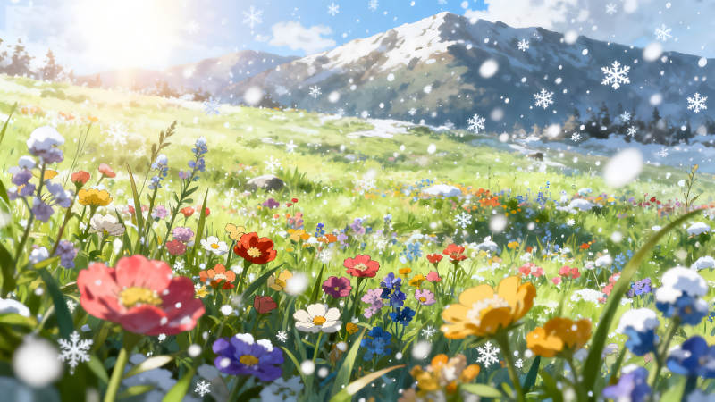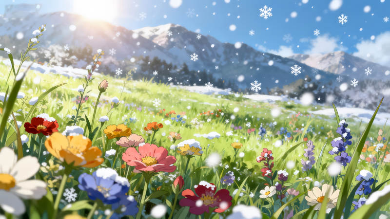 雪花飘落的花海与山景