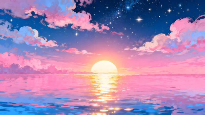 梦幻粉色海面日落景象