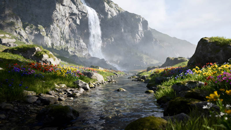 瀑布下溪流与鲜花盛开的山谷