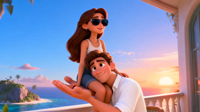 动画情侣依偎眺望风景