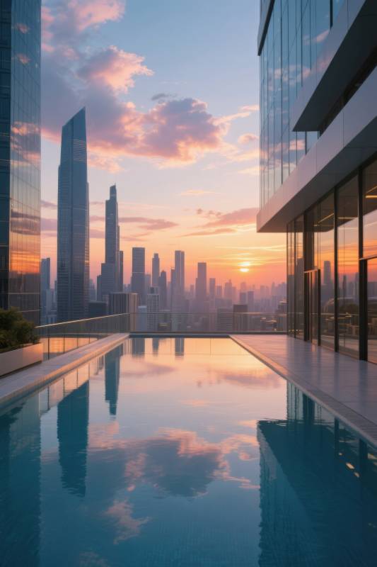 城市天际线日落泳池
