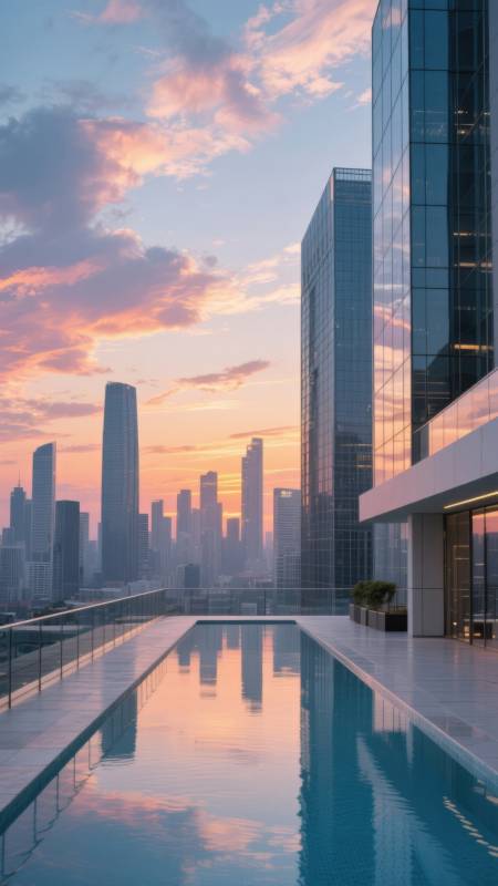 城市天际线日落泳池