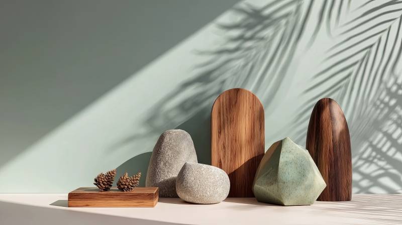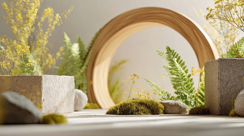 木质圆环与绿植石块摆件