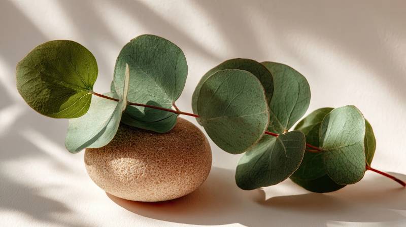 绿叶与石球的静物光影