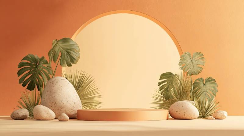 橙色背景下的绿植石块摆设