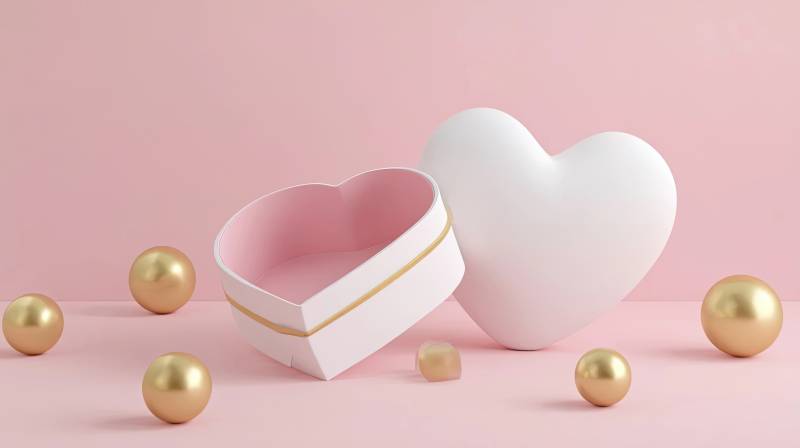粉色背景心形礼盒与金色球