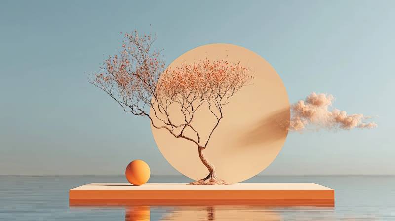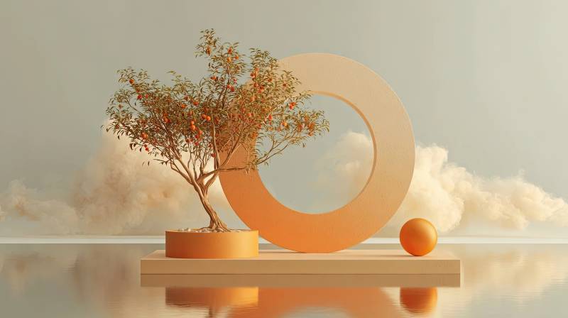 橙色果实树与环形雕塑