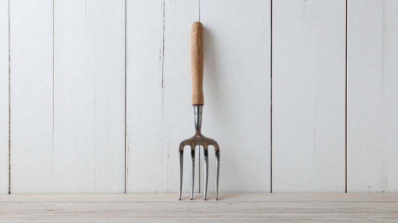 园艺叉静置于木质背景前