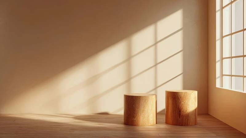 阳光洒落的木质圆凳角落