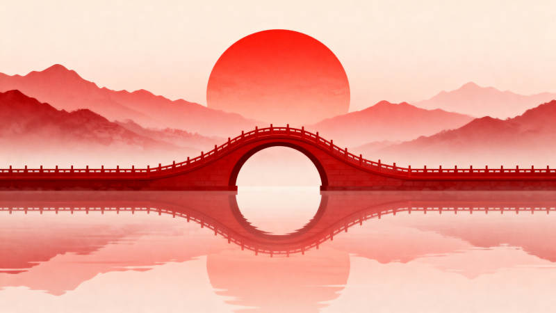 红日下的中式拱桥