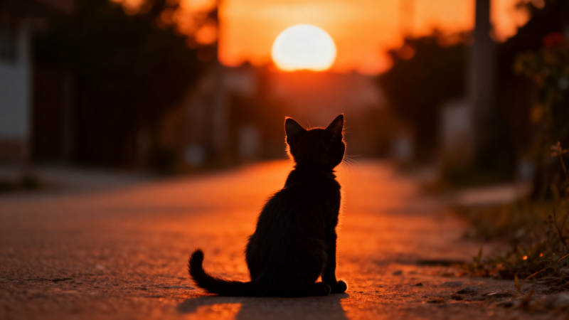 小猫背影与日落