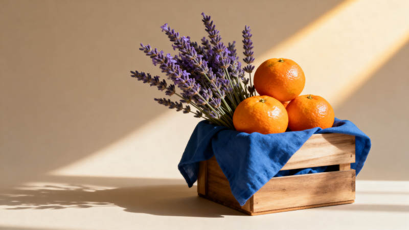 木箱中的橙子与薰衣草