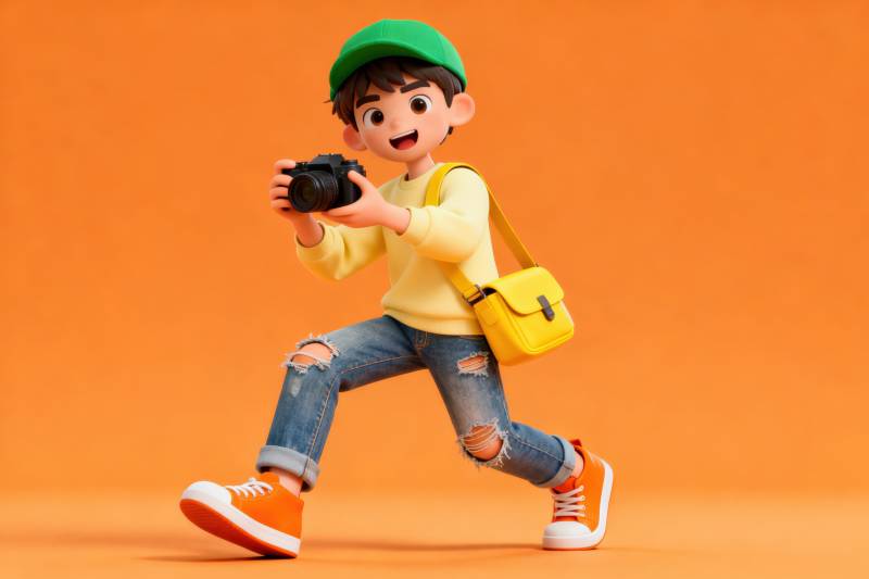 女孩手持相机奔跑拍照