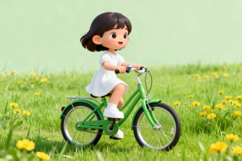 小女孩骑自行车草地
