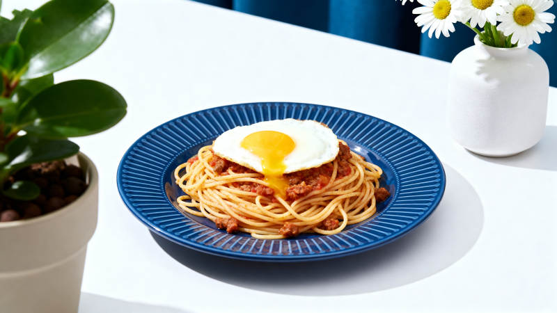 蓝色盘子上的意面煎蛋