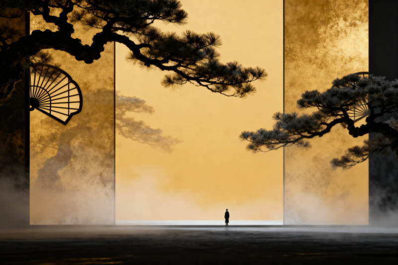松树剪影与扇形装饰