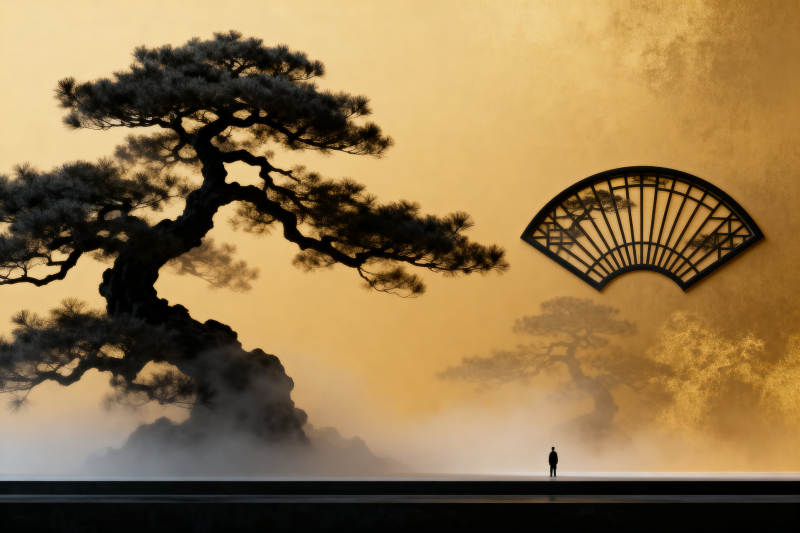 松树与扇窗的东方意境