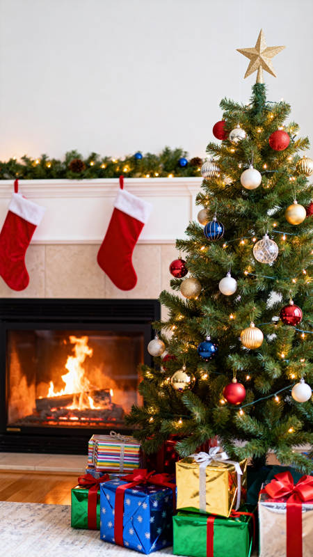 圣诞树与壁炉的节日氛围