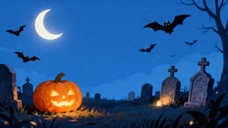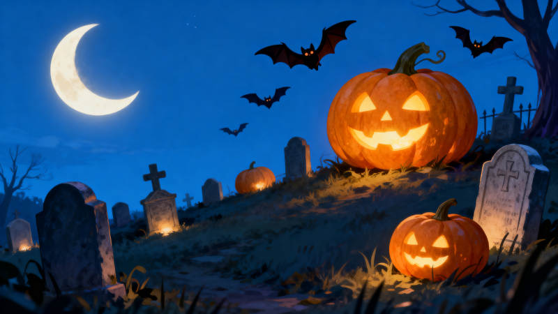 万圣节夜晚墓地南瓜灯