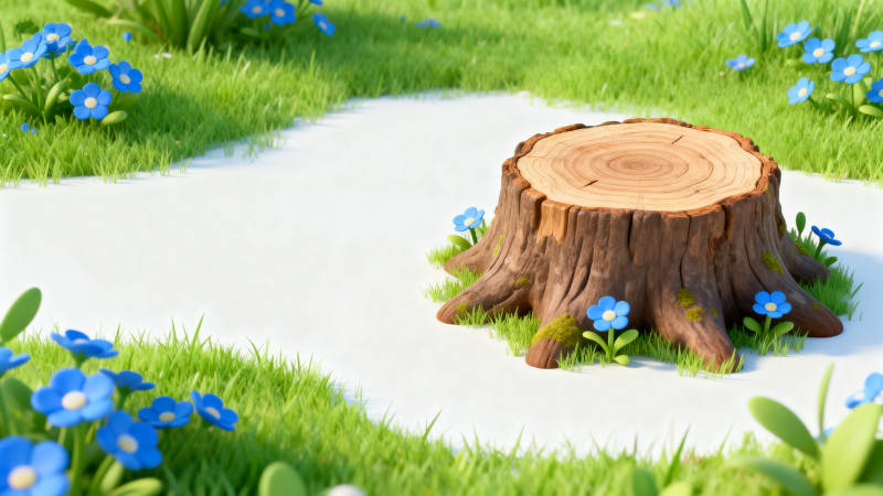 树桩与蓝色花朵的自然场景