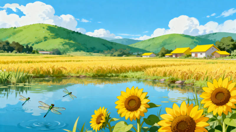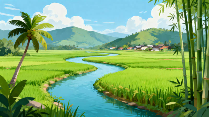 稻田河流乡村风光