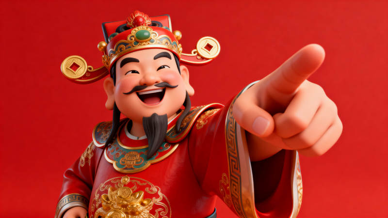 财神爷指向前方笑容满面