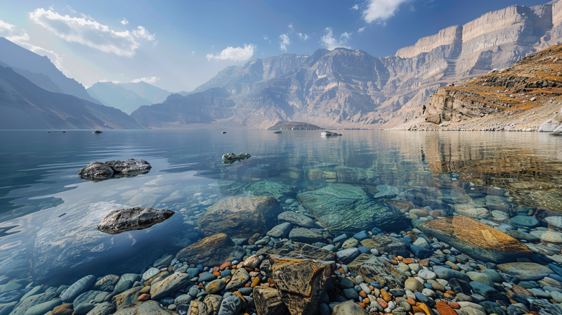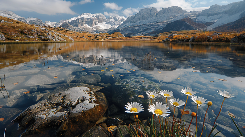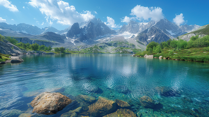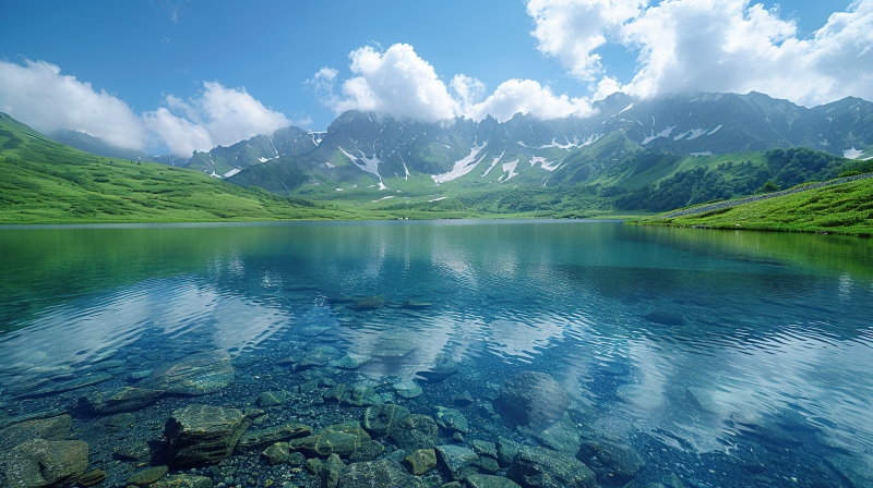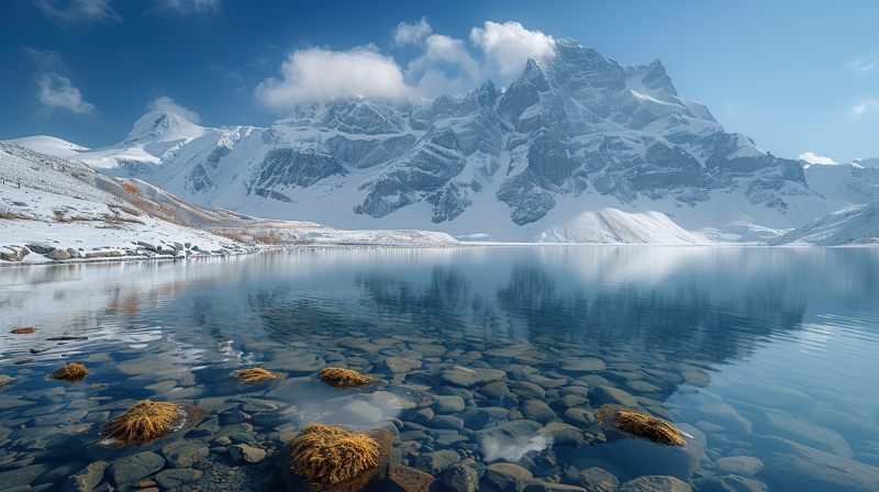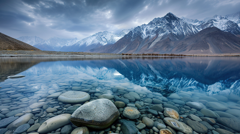 雪山倒影湖畔石