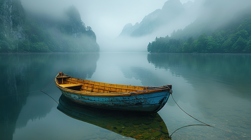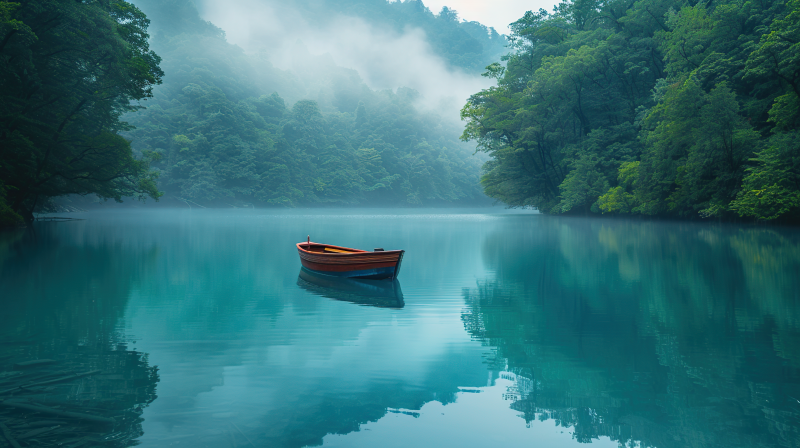 雾湖孤舟