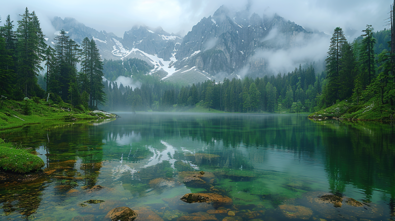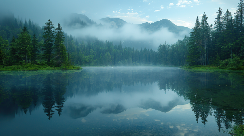 碧湖雾林静谧景
