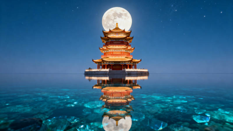 月下楼阁倒影