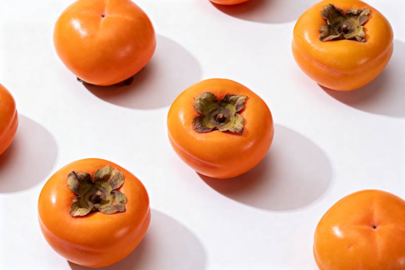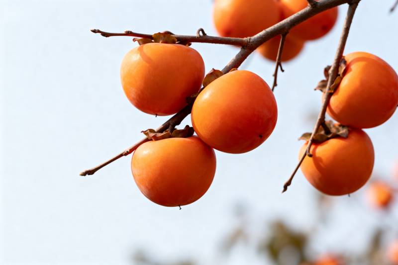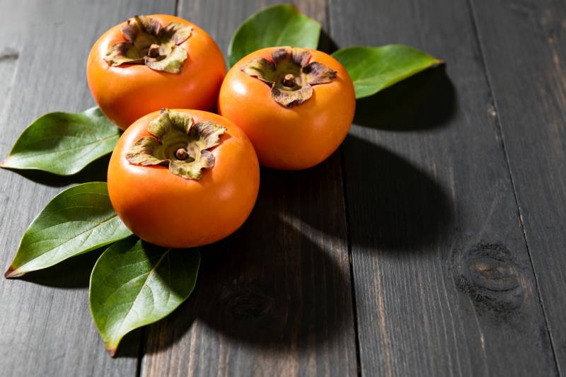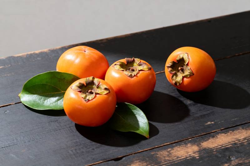 四颗柿子静置于木桌