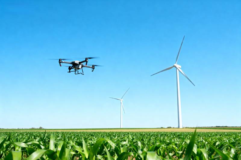 无人机巡田风车旁