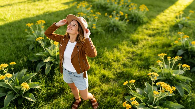 戴草帽女子在绿植前闭目养神
