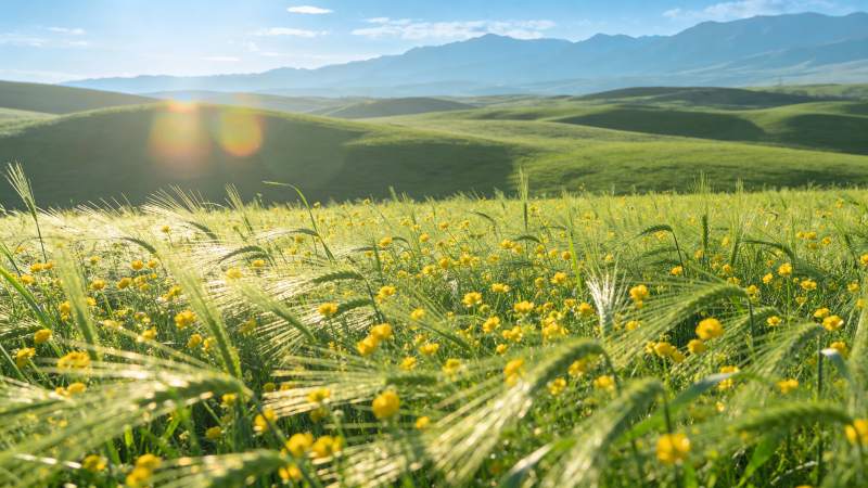 绿野黄花映山峦