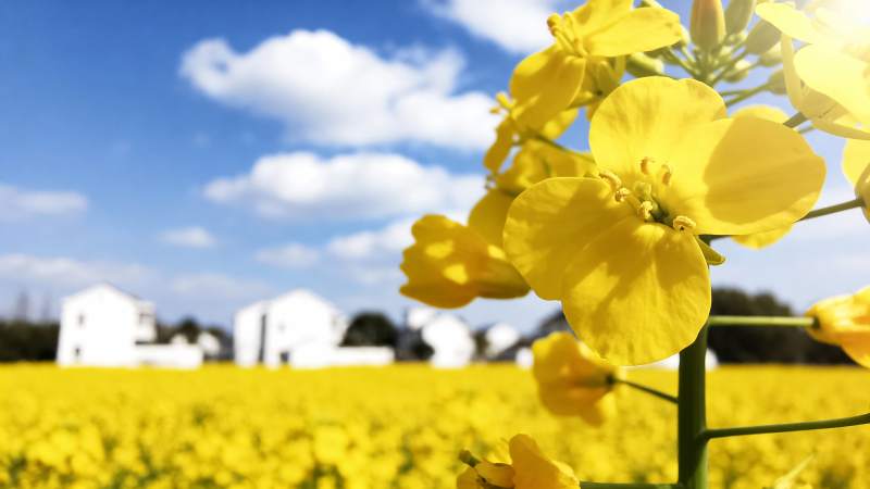 油菜花田与白墙房屋